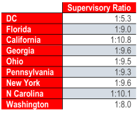 Another difference is in supervisory ratios. Even though grade levels are much higher in DC than in the rest of the country, the number of supervisors per employee is almost twice the number in Ohio, Georgia, or any other state. The difference is partly caused by the type of work in the field. We typically see more jobs that are done in larger teams. In DC, we see smaller work units that are more specialized.