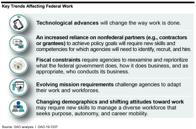 Recent Government Accountability Office testimony before the House of Representatives, Talent Management Strategies to Help Agencies Better Compete in a Tight Labor Market, highlighted several challenges the government faces as it competes for talent in an increasingly tight labor market. GAO identified five key trends.