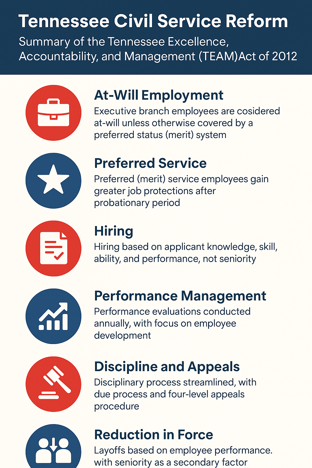 In 2012, Governor Bill Haslam signed into law the Tennessee Excellence, Accountability, and Management Act (TEAM Act). The law significantly overhauled the state’s personnel system for executive branch employees. The goals were to modernize hiring, improve performance management, and align the state workforce with 21st-century operational needs.